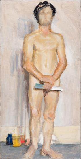 Painterly full-length male nude standing in a studio, loosely rendered with indistinct features