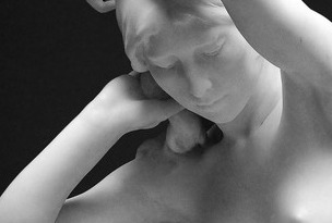 The collarbone stretches taut between the lifted arm and the torso's twist, creating a geography of tension in stone — the hollow at the throat, the shoulder blade pulling away. Light pools here as if drawn to vulnerability.