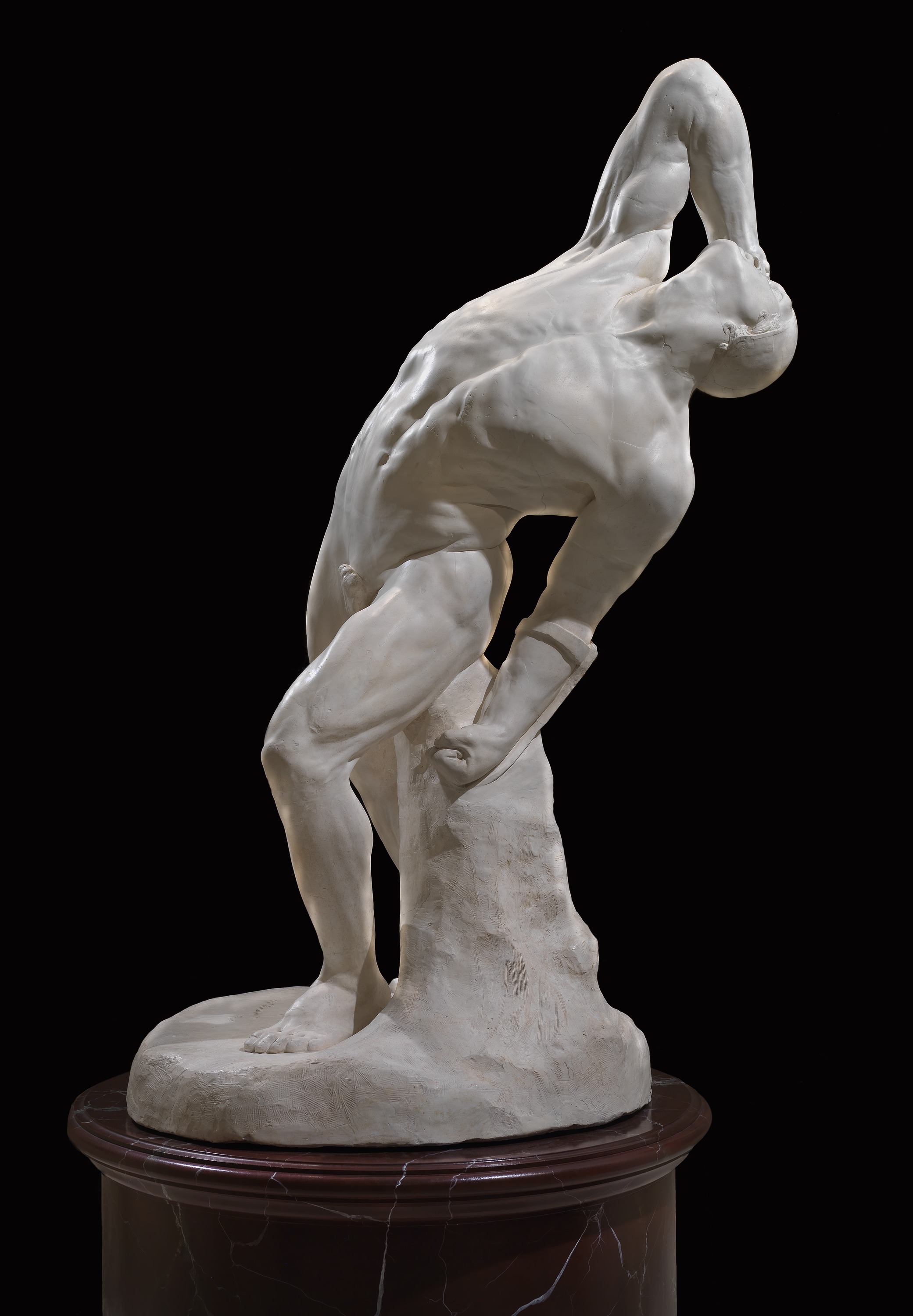 Classical marble sculpture of a muscular male figure in a dramatic, strained backward-arching pose on a dark pedestal