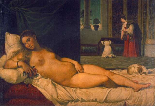 This painting depicts a reclining nude woman in an opulent Renaissance interior, with attendants visible in the background. The artist follows Titian's celebrated composition, employing rich warm tones and careful attention to fabric textures and flesh. The figure's pose creates a dynamic asymmetry across the canvas, while the interplay of light and shadow models her form with subtle gradations. This homage demonstrates the enduring influence of Venetian Renaissance masters on the tradition of the reclining nude in Western art.