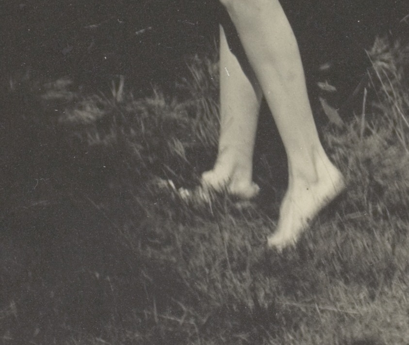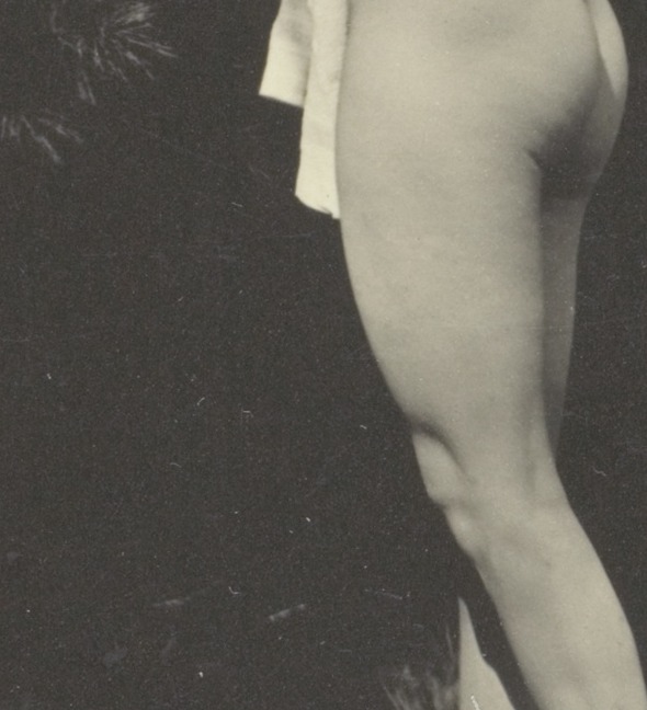 The sinuous line from waist to upper thigh — the contour that distinguishes this from sculpture, the living asymmetry of weight shifted onto one leg, hip cocked slightly, the towel barely touching skin at the side
