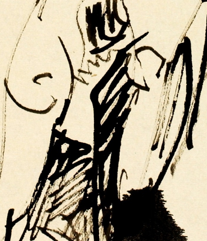The upper thigh dissolving into dense, almost violent cross-hatching at the bottom — the figure becoming shadow, form becoming abstraction. The ink pools like dusk gathering. There's a letting-go here, the body releasing itself from representation.
