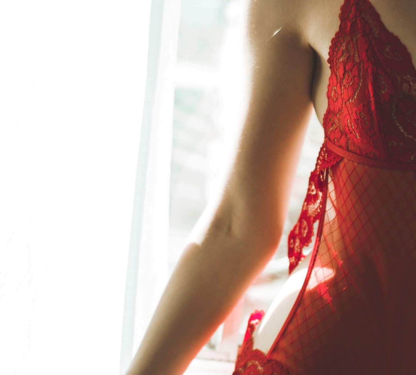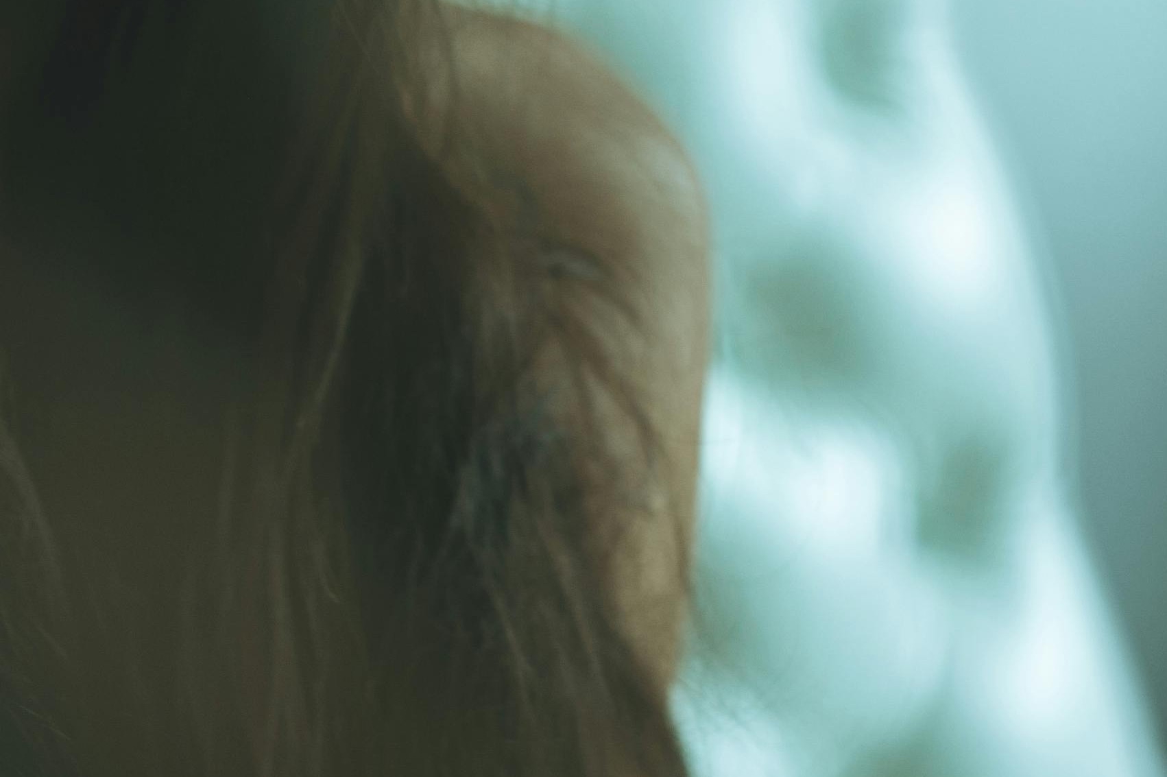 The bare shoulder emerging from behind the fall of hair is the image's quiet resolution — the body implied beyond the frame, skin rendered in a warm amber glow against the aqueous background. It suggests vulnerability and proximity without insistence.