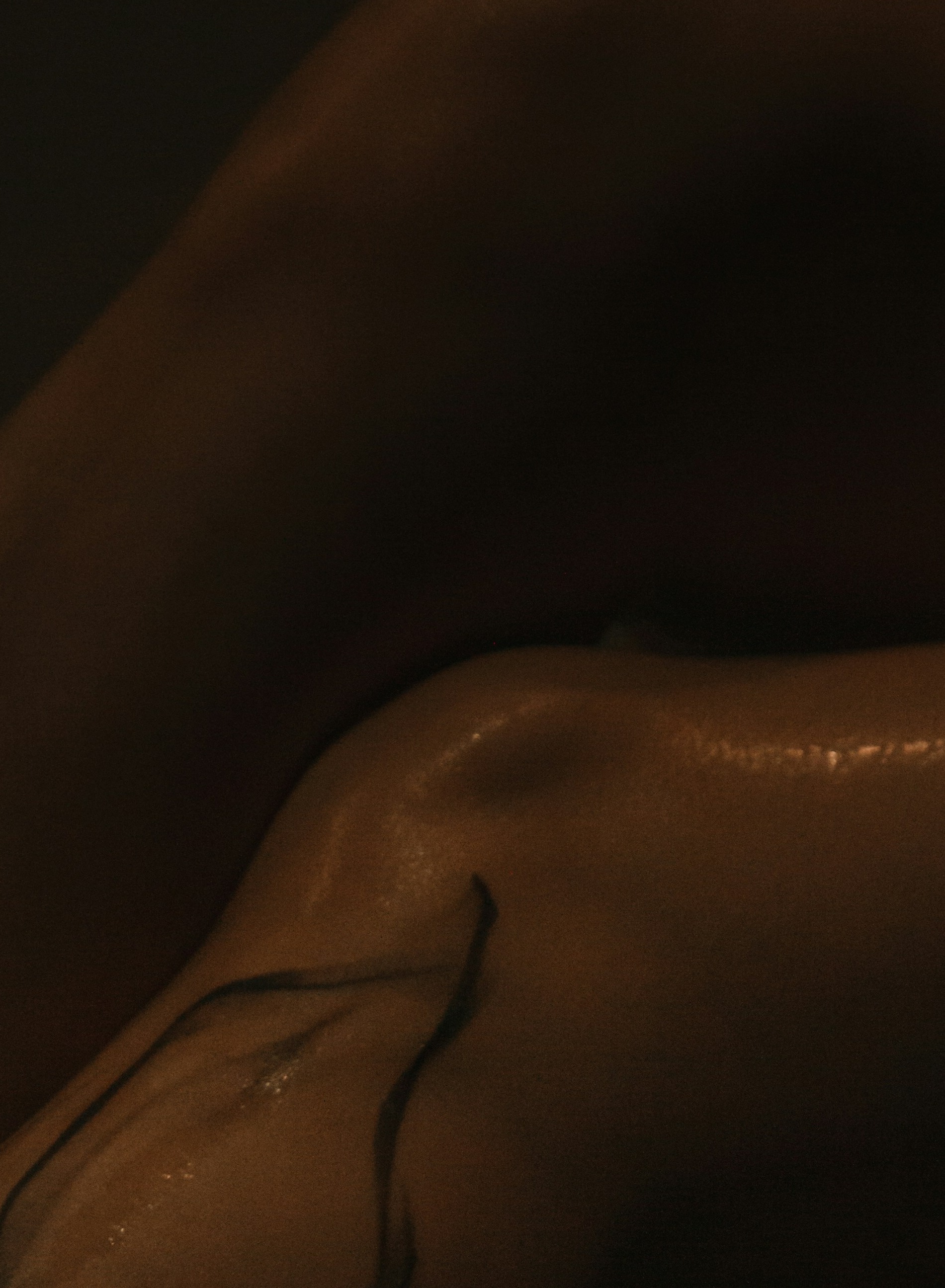 The apex where the hip crests and light catches the highest point of the body's curve — the gleam on the bone beneath skin is the image's most luminous and vulnerable moment, the body reduced to its most essential architectural line