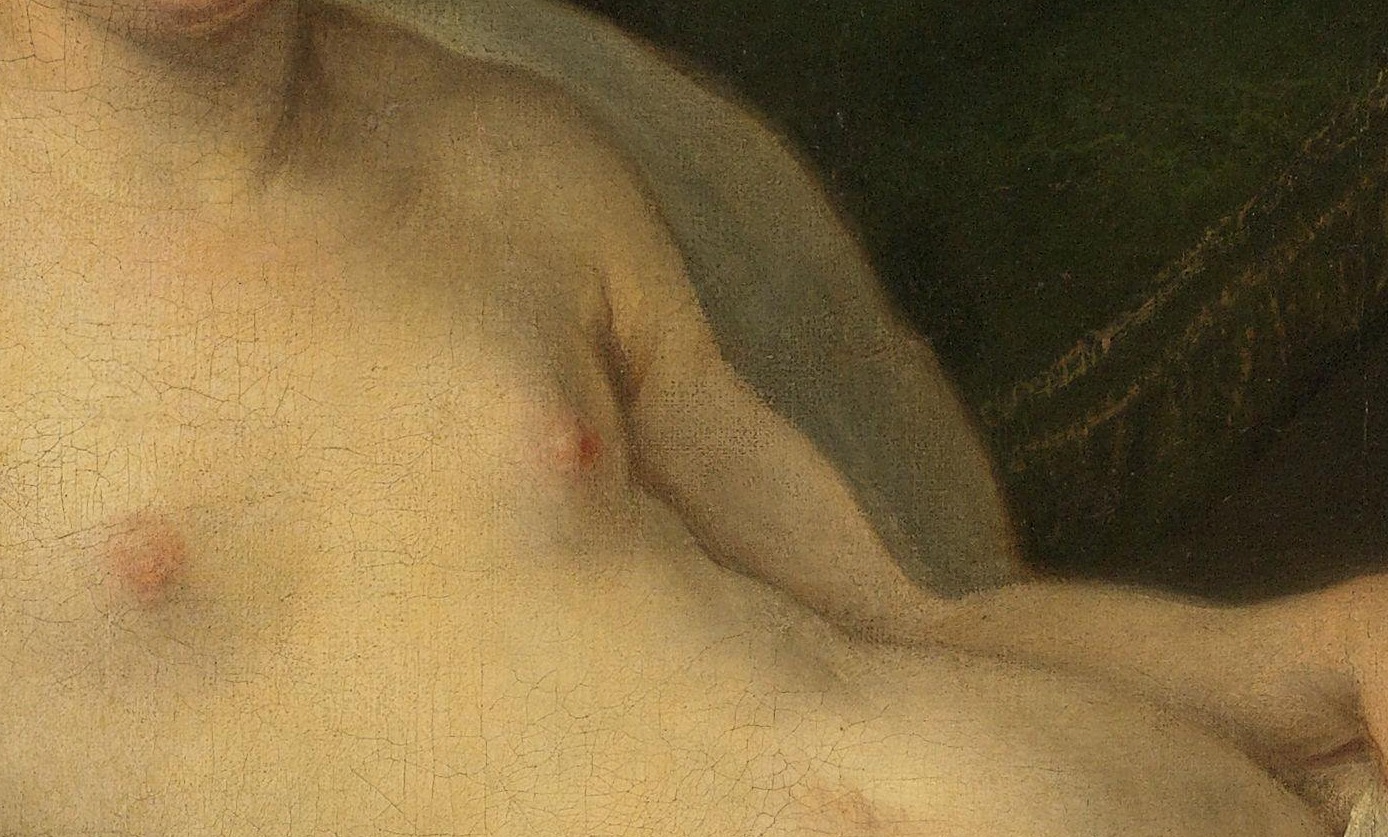 The right wrist adorned with a gold bracelet rests against the white linen — jewelry as the last ornament on otherwise unadorned skin. The bracelet marks the threshold between the vulnerable inner wrist and the luxurious fabrics, a civilized detail that heightens the nakedness.
