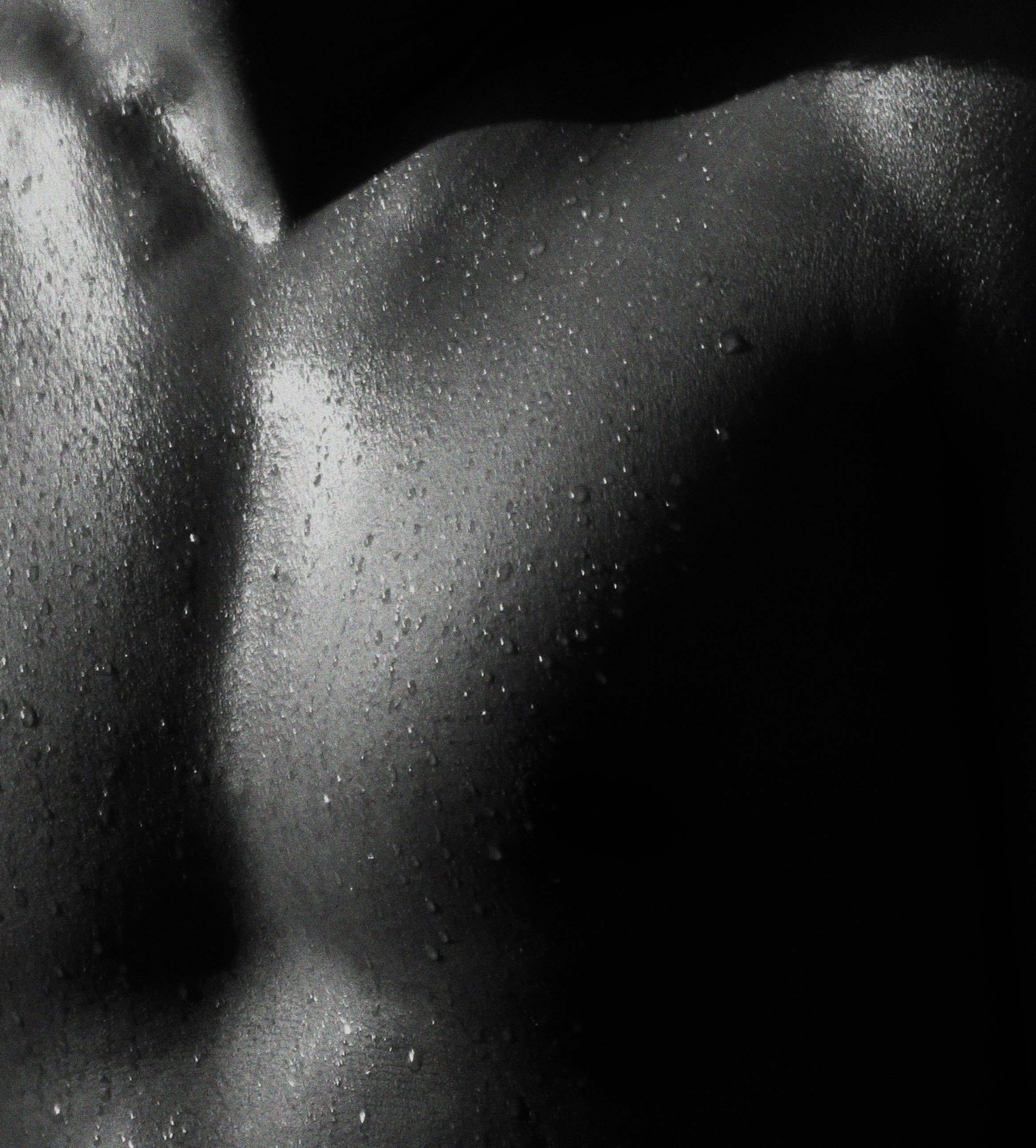 Black and white close-up of water-beaded skin, shoulder and upper back in dramatic chiaroscuro lighting