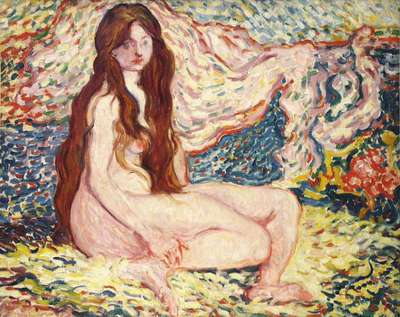 Nude woman with long auburn hair seated in a vibrant, expressionistic landscape rendered in post-impressionist style