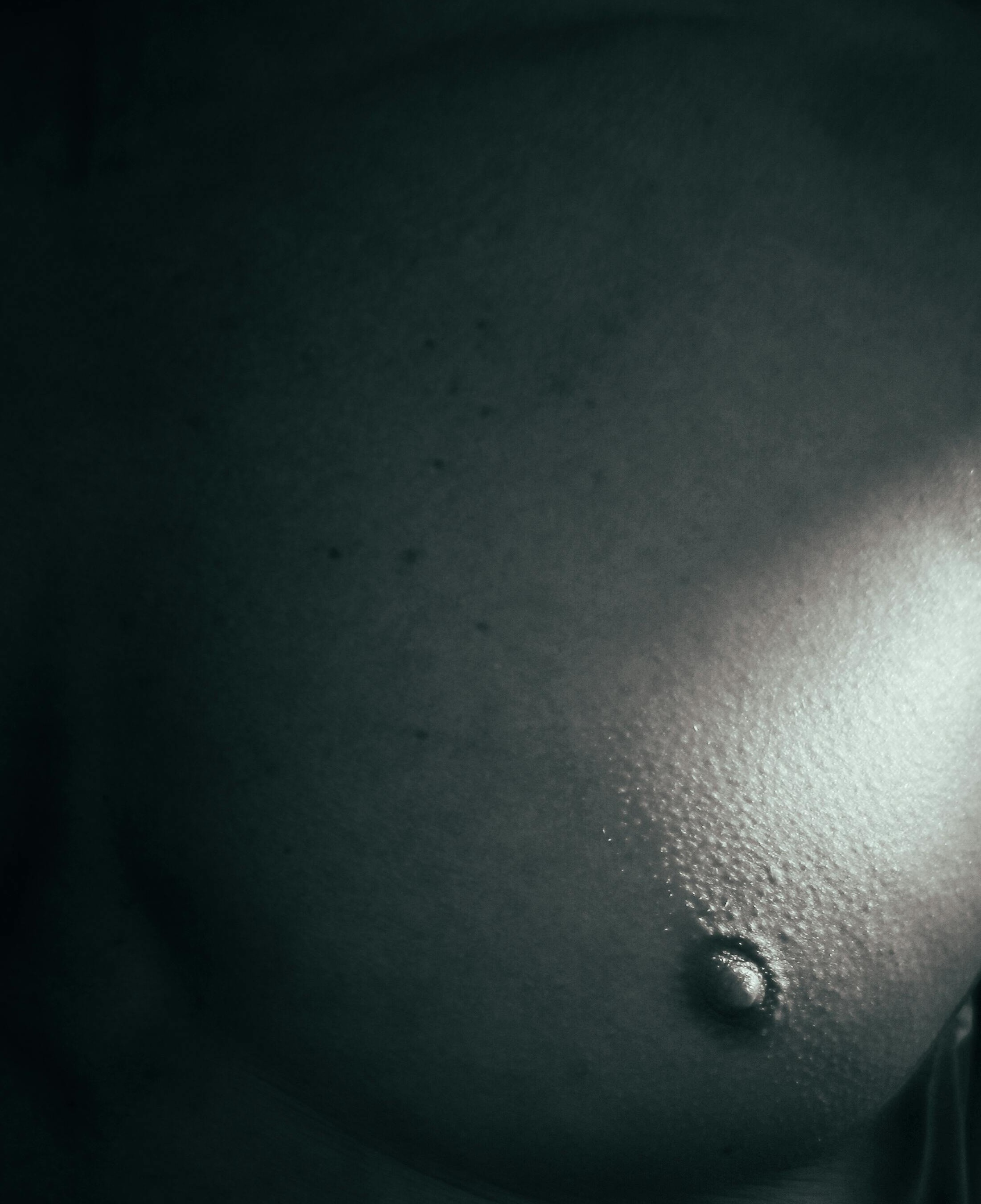 The pectoral muscle caught in raking sidelight, goosebumps stippling the skin — involuntary response made visible. The nipple becomes a punctum, a point of vulnerability on an otherwise armored surface. The tension between hardness and sensitivity is where the charge lives.