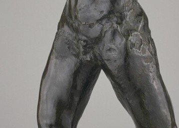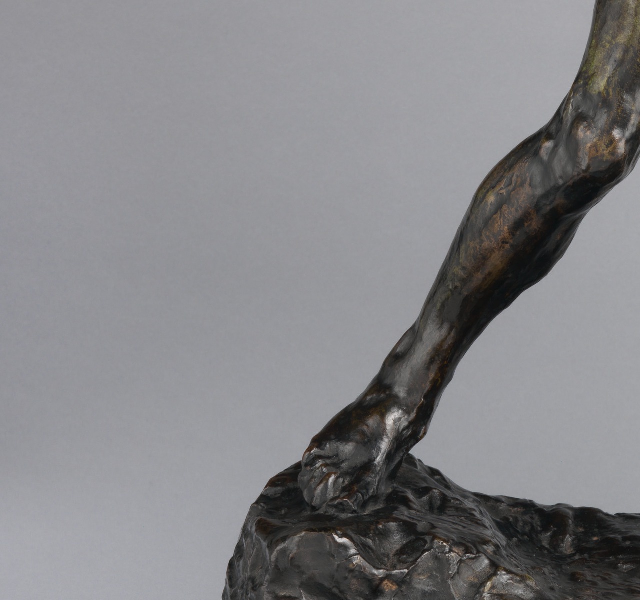 The long diagonal of the extended legs in their wide stance, tendons taut, the inner thigh catching shadow — this is where Rodin's figure is most kinetically alive. The musculature strains against the bronze surface, and the rough base rising around the feet suggests the figure is pulling itself from the earth.