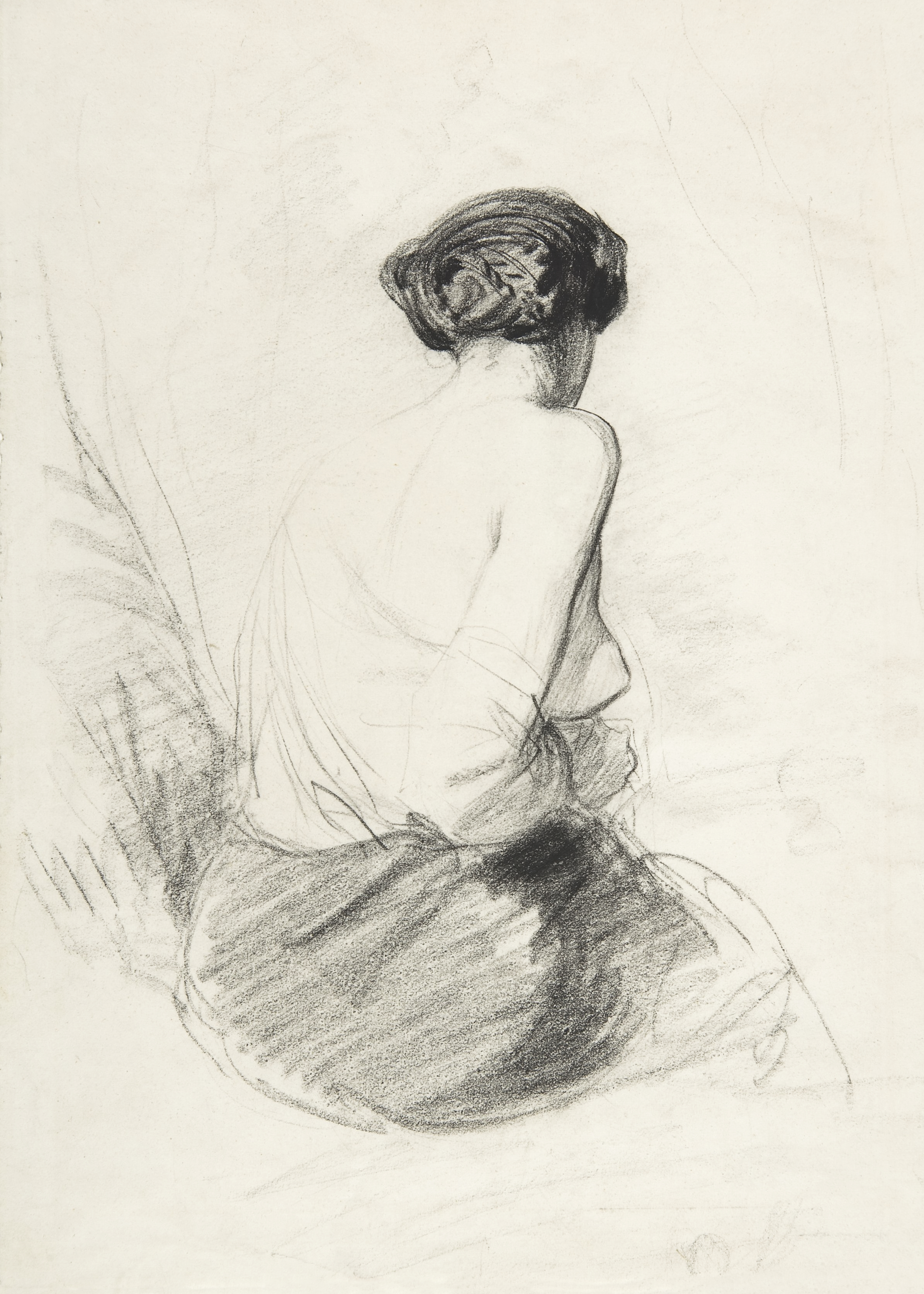 Charcoal life drawing of a seated woman viewed from behind, bare back with hair pinned up