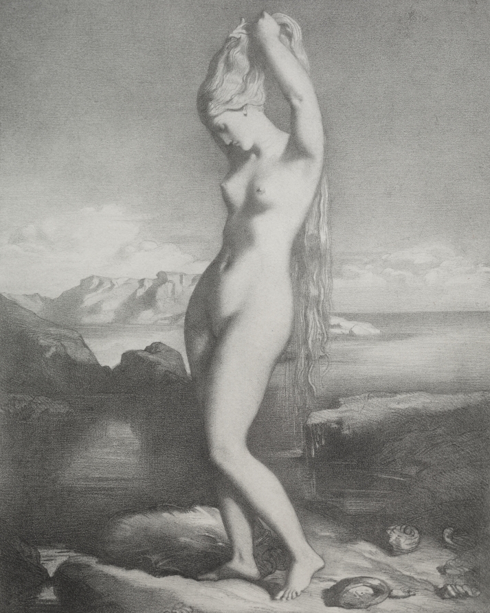 Standing nude female figure on rocky shore, arm raised gathering long hair, seashells at feet, classical Venus iconography rendered in graphite or lithograph