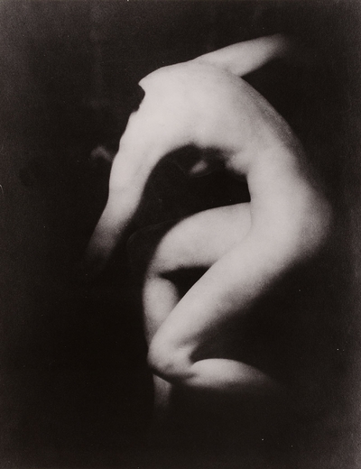 Soft-focus black-and-white nude torso curled in deep chiaroscuro shadow