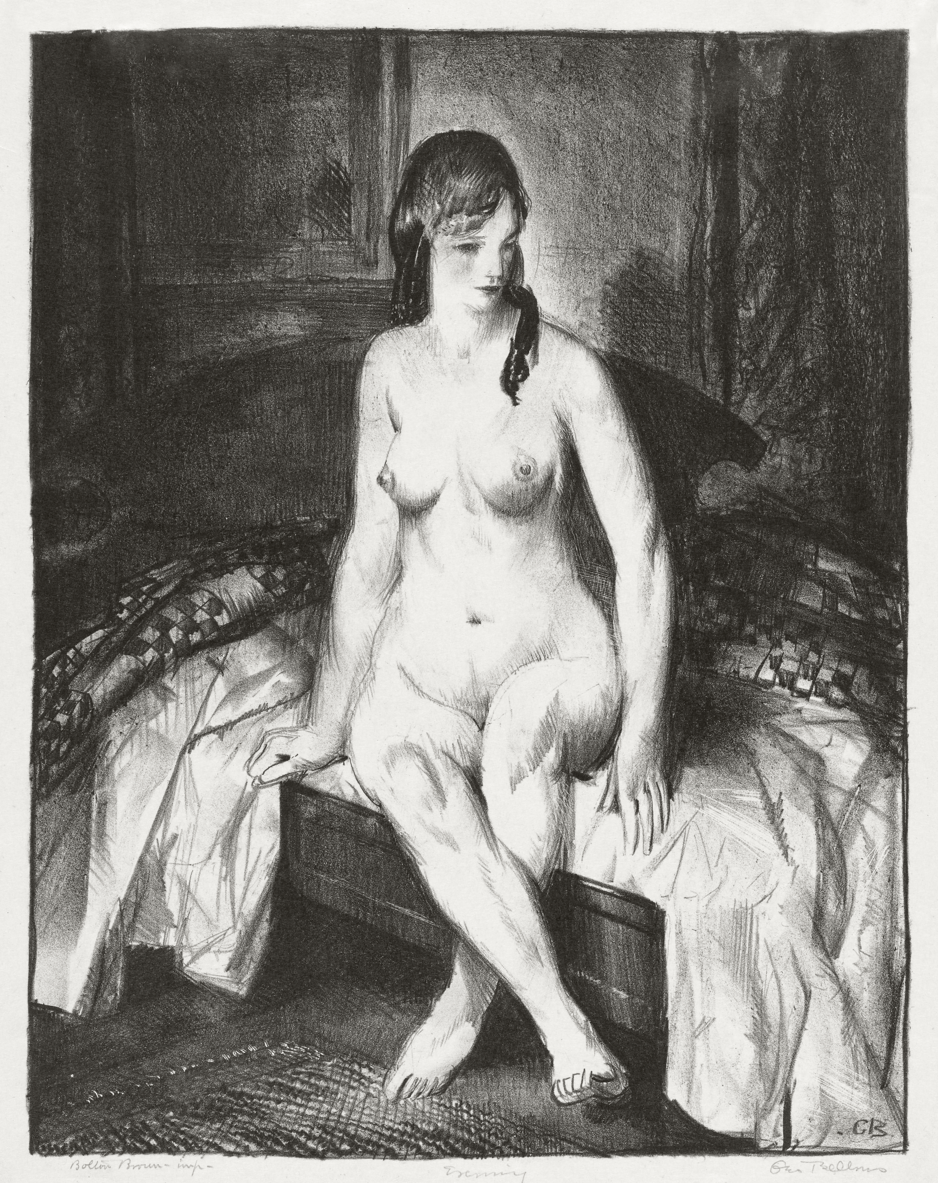 Lithographic nude figure seated on bed edge in dramatic chiaroscuro