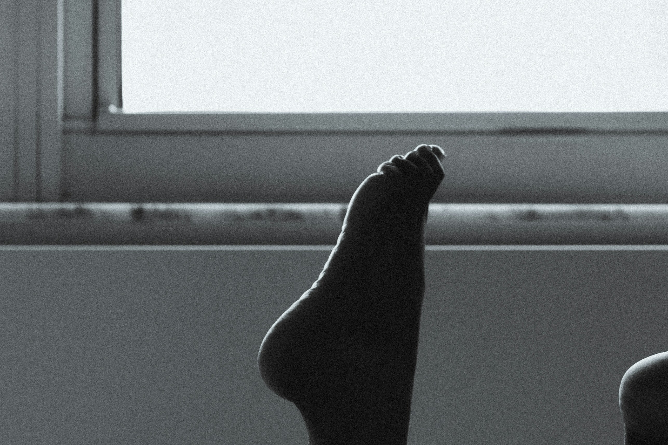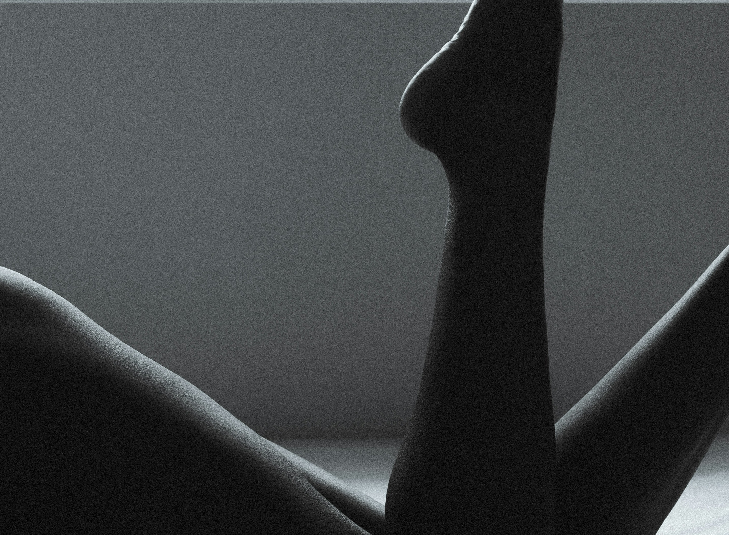 The crossed and splayed legs rendered almost entirely in silhouette — the geometry of limbs against white sheets creates an abstract calligraphy of desire. The darkness conceals while the form implies everything.