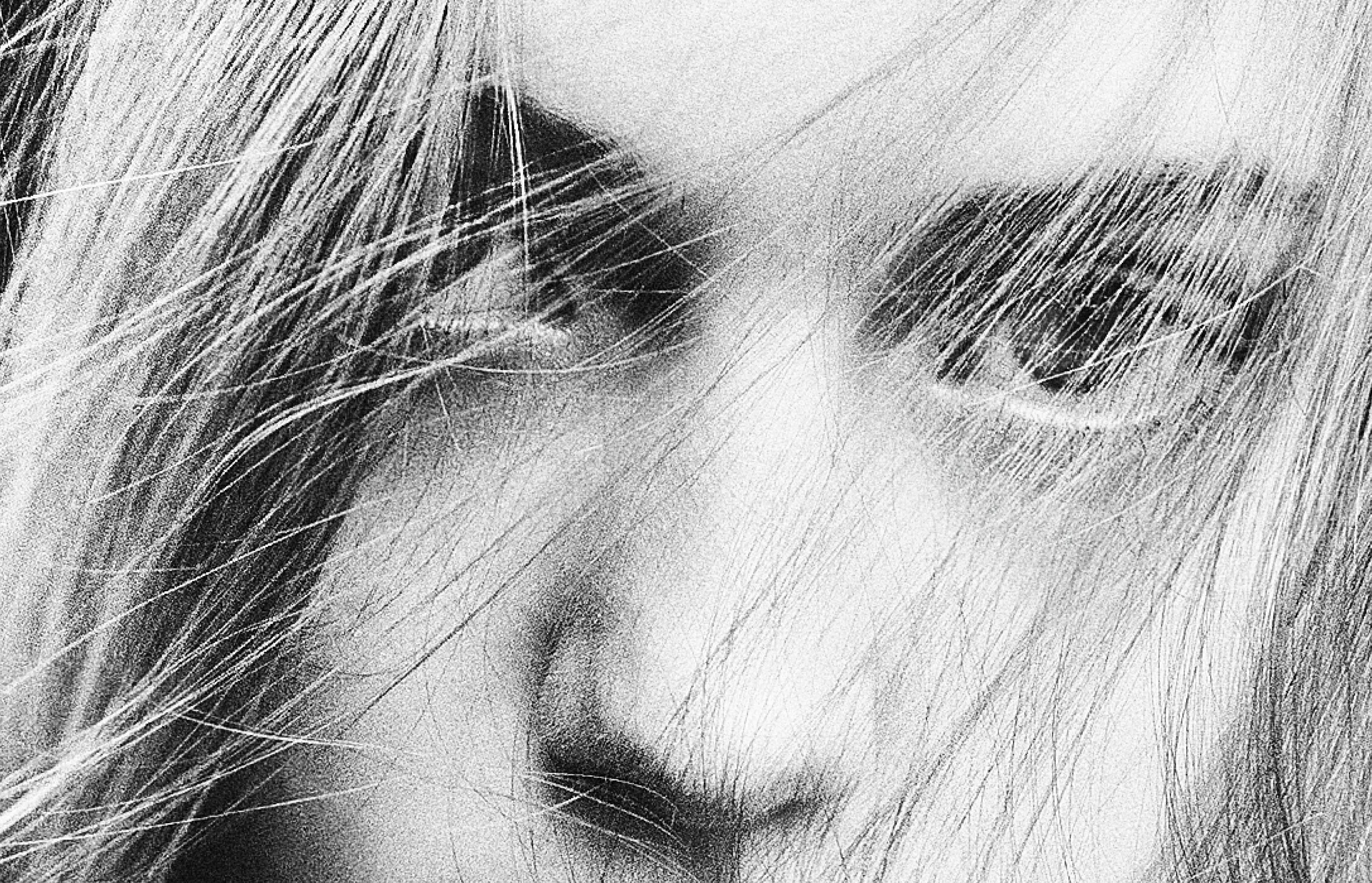 The eyes are partially veiled by wind-blown hair, creating a sense of mystery and invitation — the gaze is there but withheld, half-obscured, which intensifies the desire to be seen by her