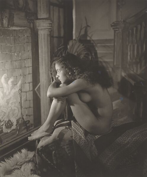 Nude woman seated in contemplation by fireplace in soft sepia light