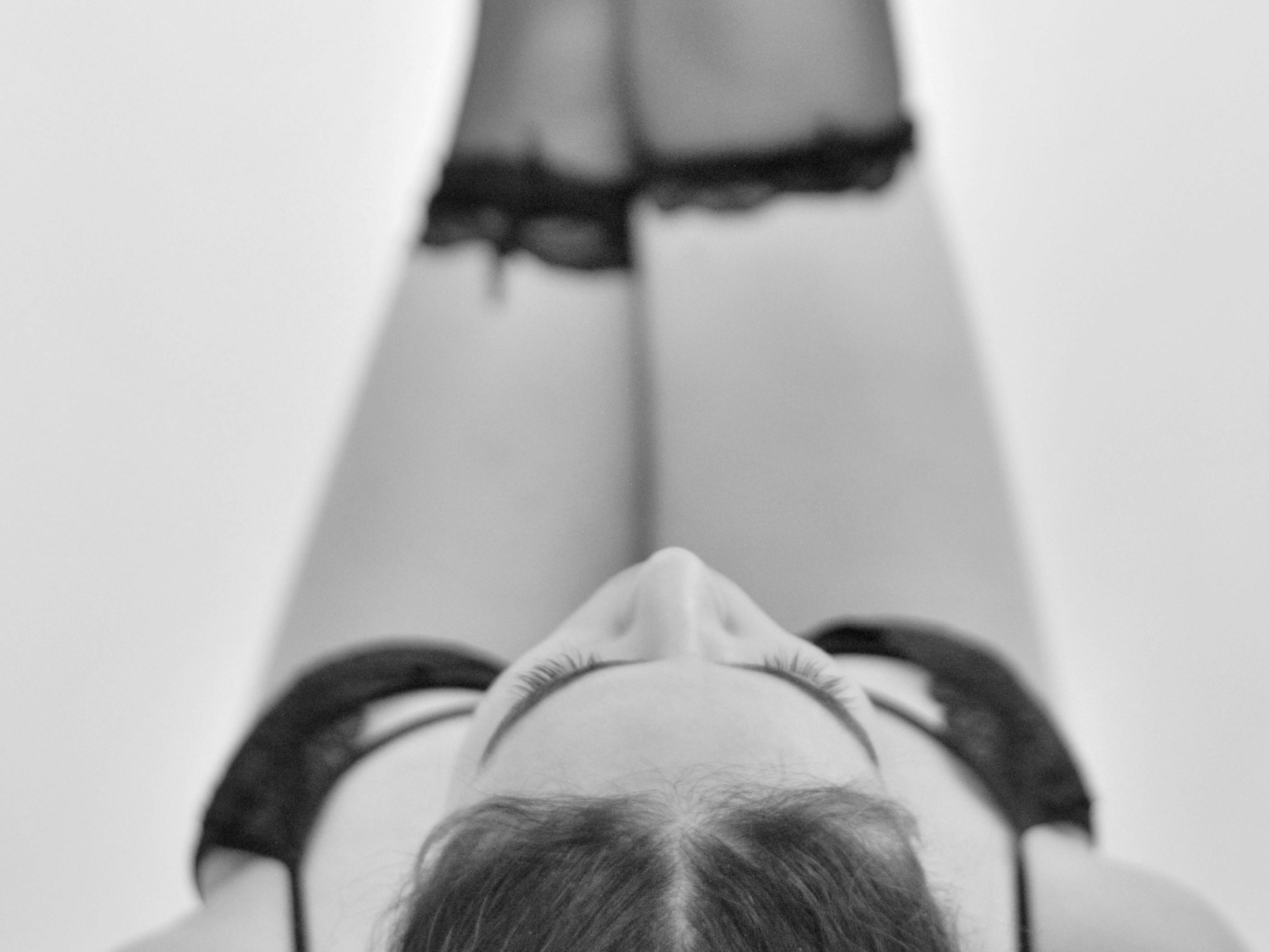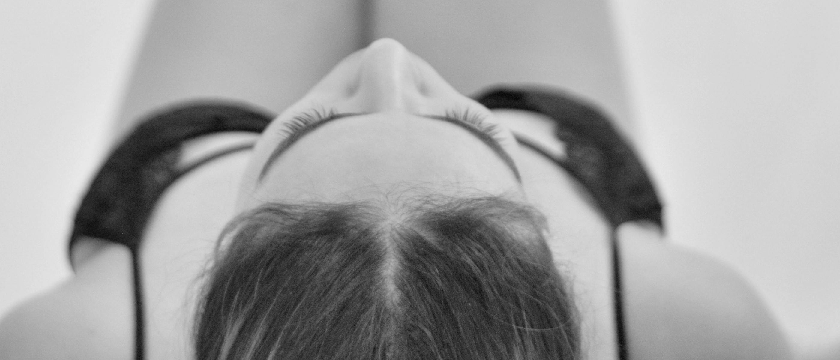 The inverted view of the collarbone and upper chest framed by dark lace straps — the architecture of bone beneath skin, the delicate tension between fabric and flesh, the straps drawing diagonal lines across pale skin
