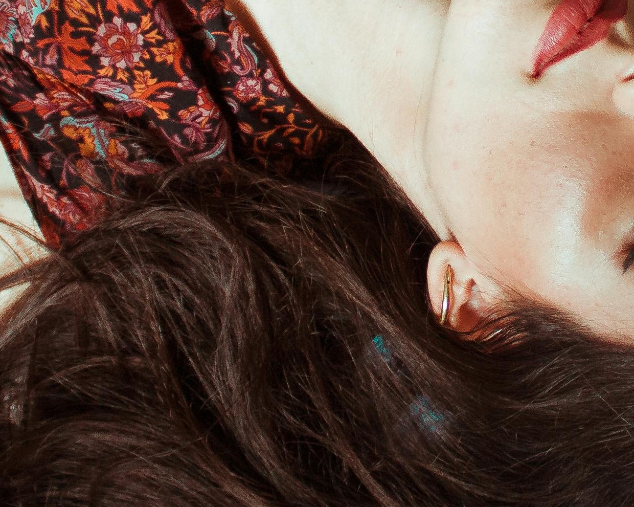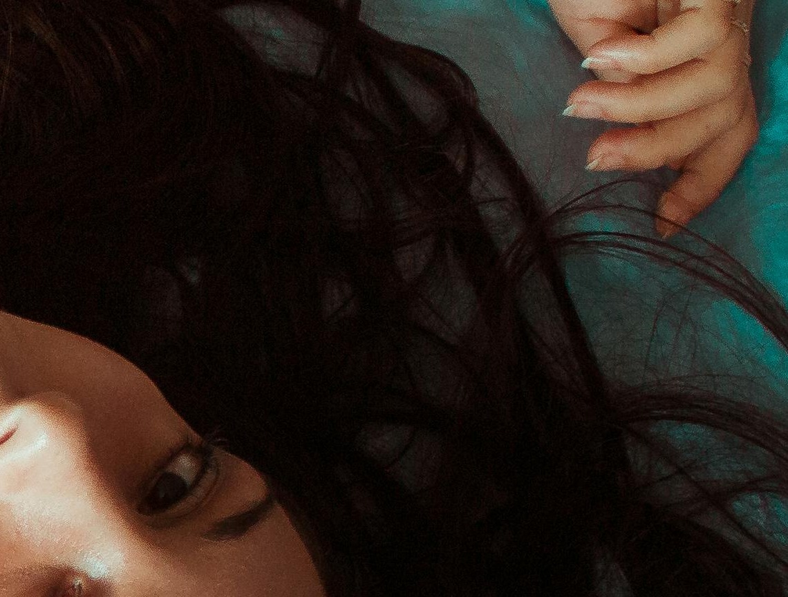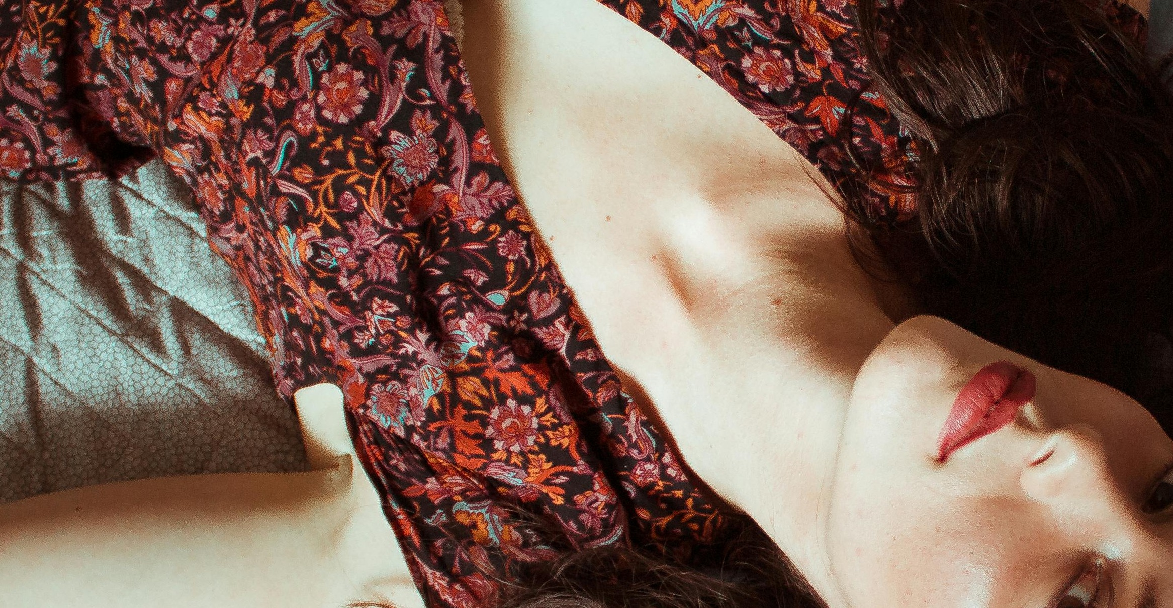 The slightly parted lips and the direct, upward gaze from the recumbent position — she looks at the viewer from below, inverting the power dynamic, mouth softly colored and half-open as if mid-breath