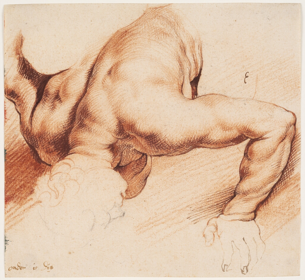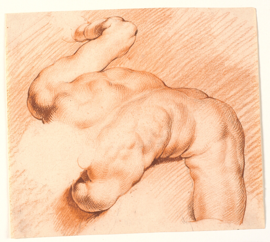Red chalk anatomical study of a muscular male torso and back seen from behind