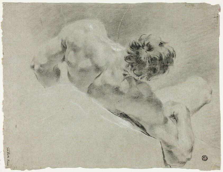 This intimate chalk study captures a male figure reclining with his back turned toward the viewer. Maggiotto employs black chalk with white highlights on blue-gray paper to model the subtle curves and shadows of the human form. The artist's sensitive handling of light reveals the figure's musculature and the weight of his relaxed pose. Such académie studies were essential exercises in 18th-century artistic training, preserving the foundational tradition of drawing from life that remains central to figurative art today.