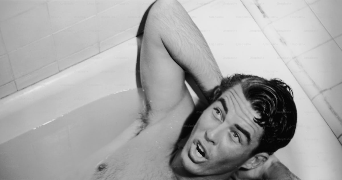 A man lying in a bathtub with his hands behind his head, circa 1955.