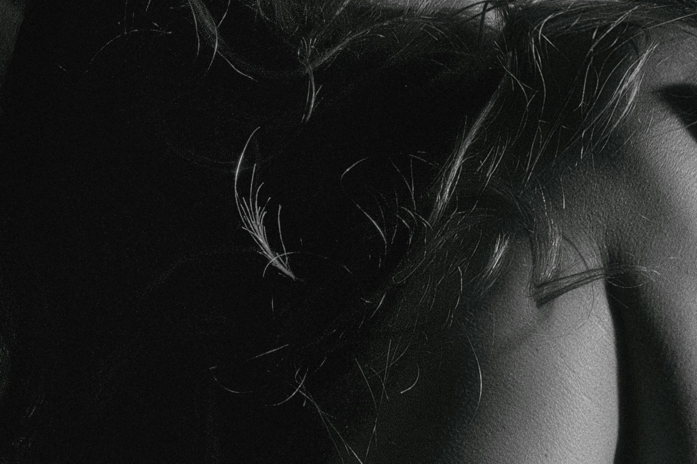 The shoulder and collarbone region where light sculpts the bone structure beneath skin, with loose hair falling across — the collision of hard skeletal architecture and soft tendrils creates a charged contrast, the body revealing its inner geometry
