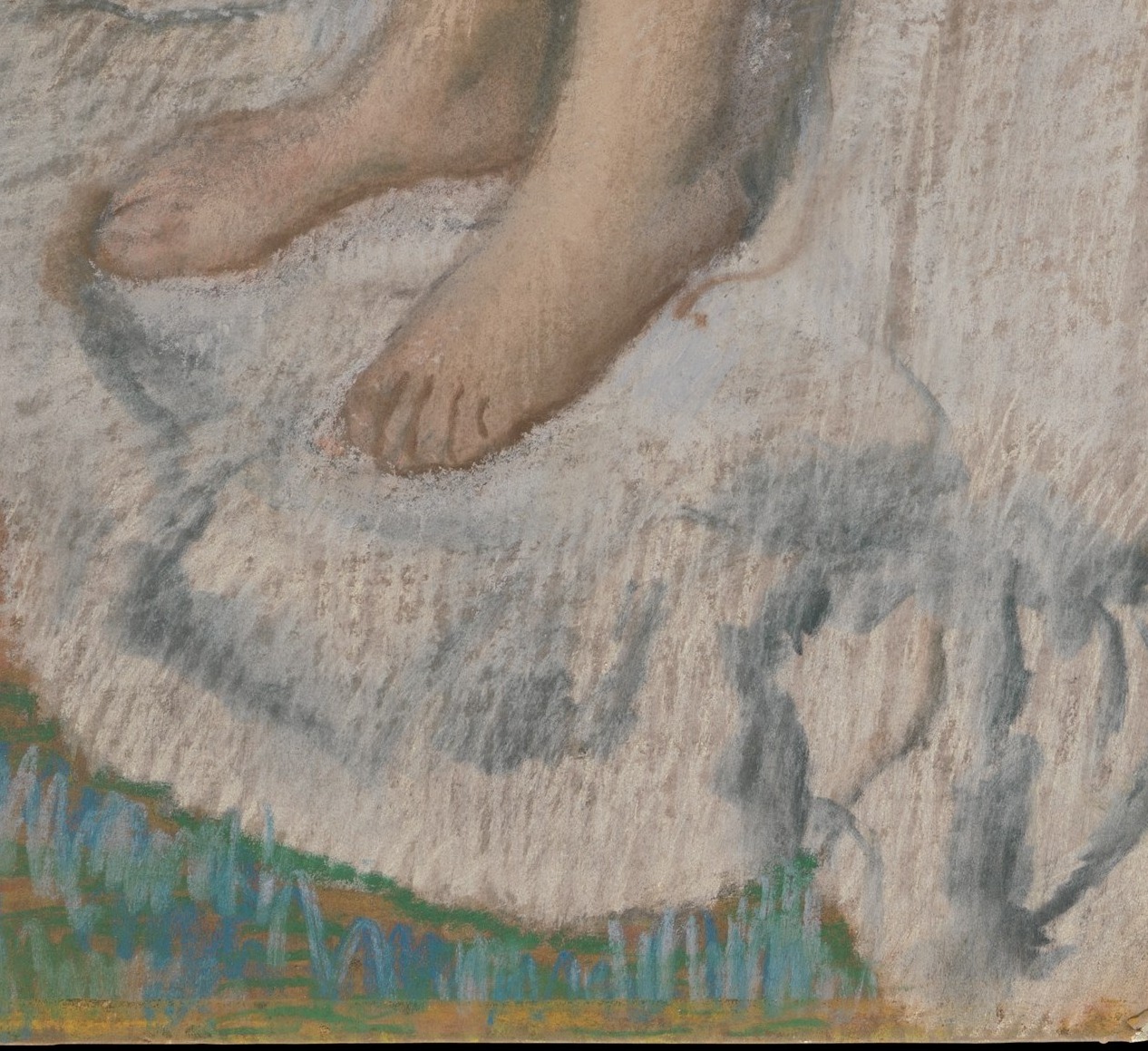 The bare foot emerging from the cascade of white linen, pressed to the floor — a grounding detail of surprising intimacy. Degas often located the body's honesty in its extremities. The foot against cloth is the painting's quiet resolution, the body at rest after bathing.