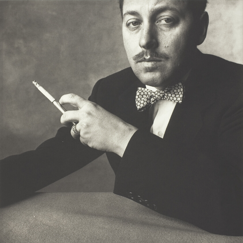Black and white studio portrait of a man in bow tie holding a cigarette
