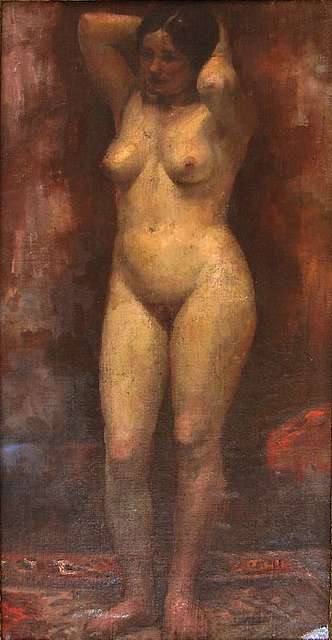 standing arms raised behind headsoft warm frontal ambientacademic oil painting classical