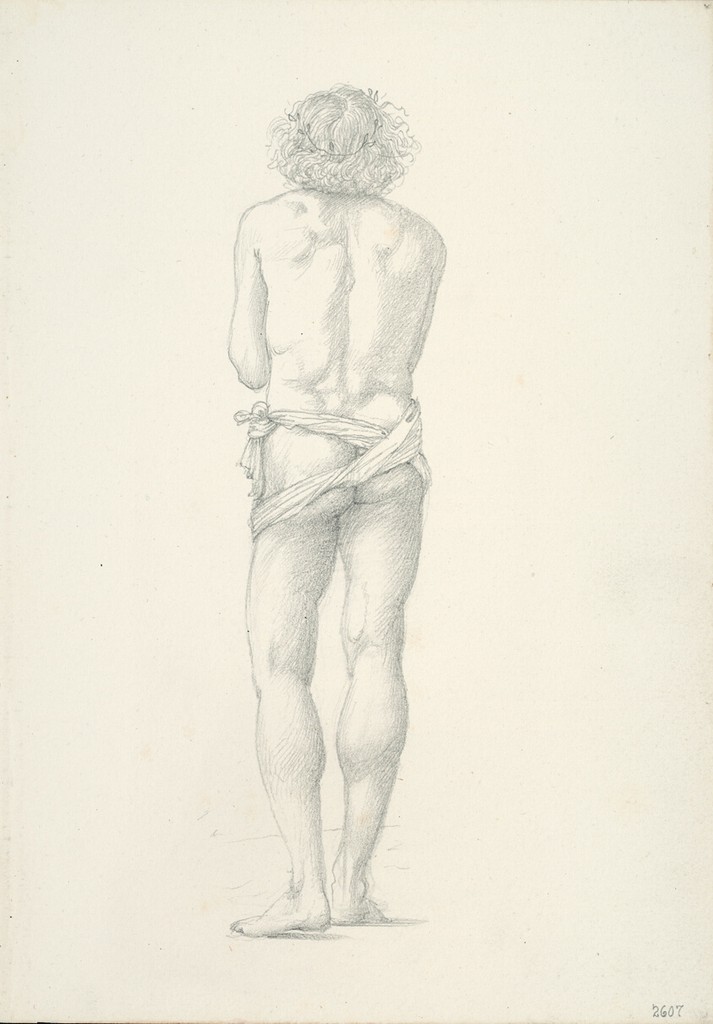 Pencil life drawing of a standing male nude seen from behind, wearing a knotted loincloth