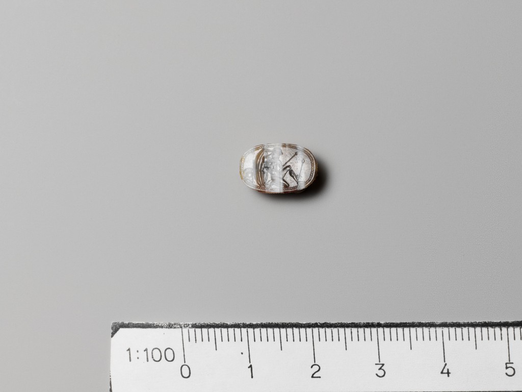 Agate scarab seal with carved intaglio figure, photographed with scale ruler