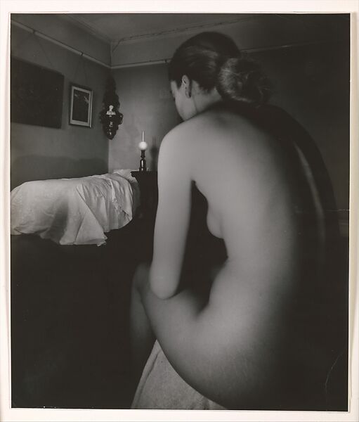Nude woman seen from behind in candlelit bedroom, black and white photograph