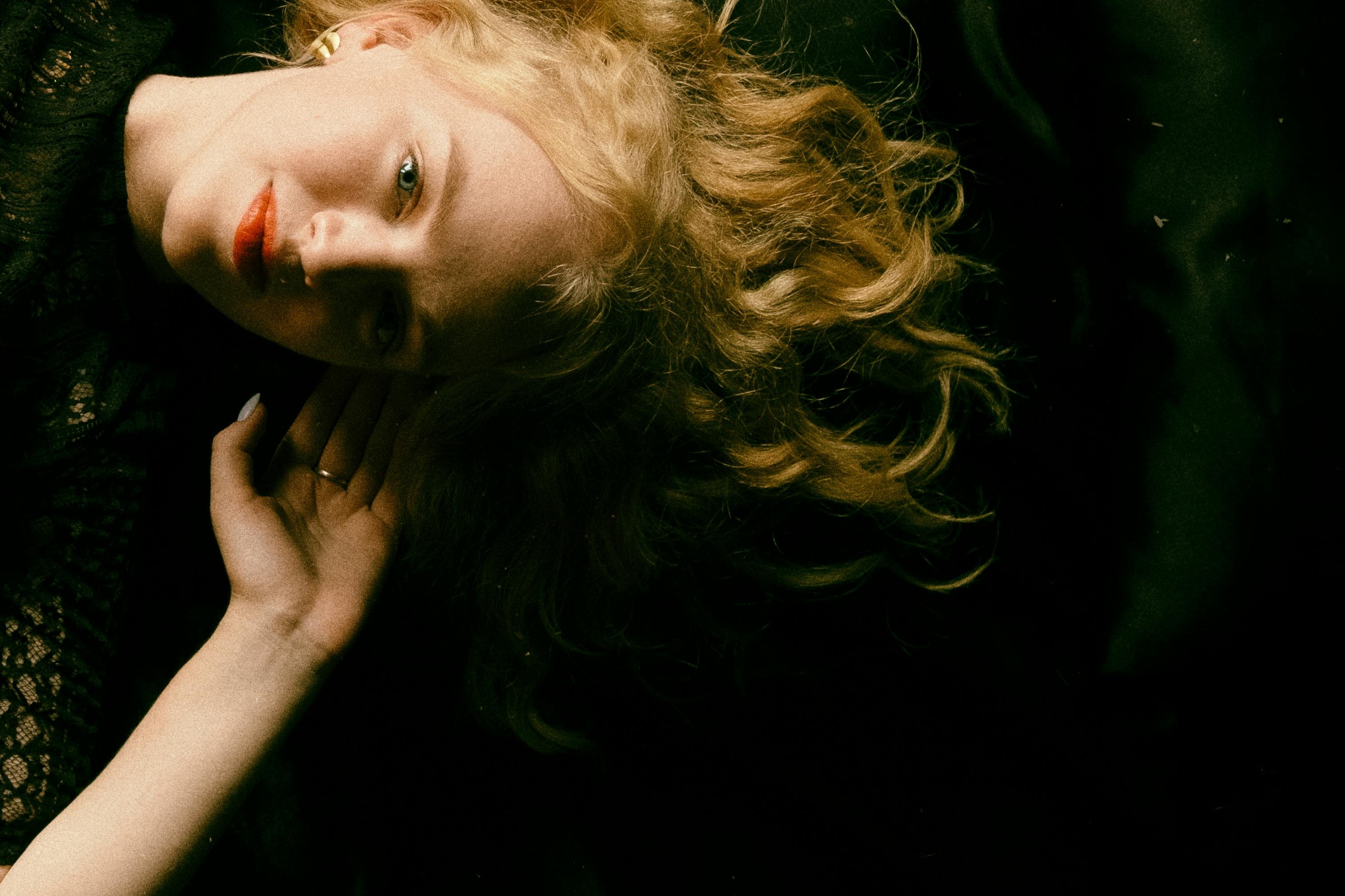 The golden curls spill across the dark satin like a Pre-Raphaelite undoing — hair as surrender, fanned out against black fabric with an almost painterly abandon. The contrast between warm blonde and deep emerald-black is where the eye first falls.