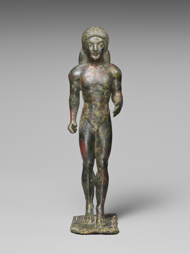 This bronze statuette depicts a kouros, the archetypal nude male youth that dominated Archaic Greek sculpture. The figure stands in the characteristic frontal pose with arms at his sides and one foot forward, displaying the Egyptian-influenced conventions of early Greek art. The youth's stylized hair and symmetrical composition reflect the period's emphasis on idealized form over naturalistic representation. This work exemplifies the foundational role of the kouros type in establishing Western traditions of heroic male nudity in art.
