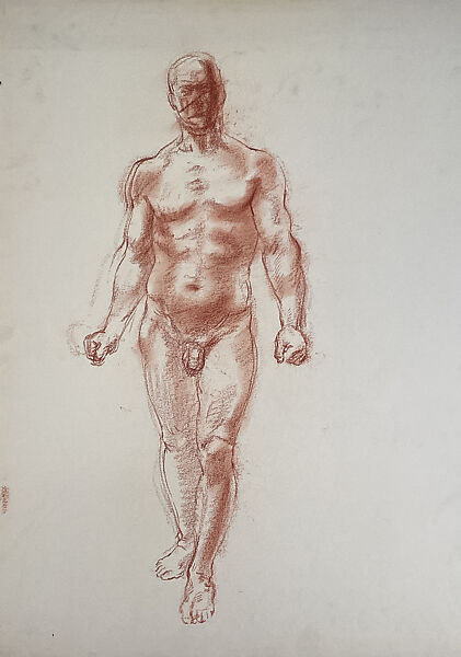 Red chalk academic figure study of a standing nude male walking forward