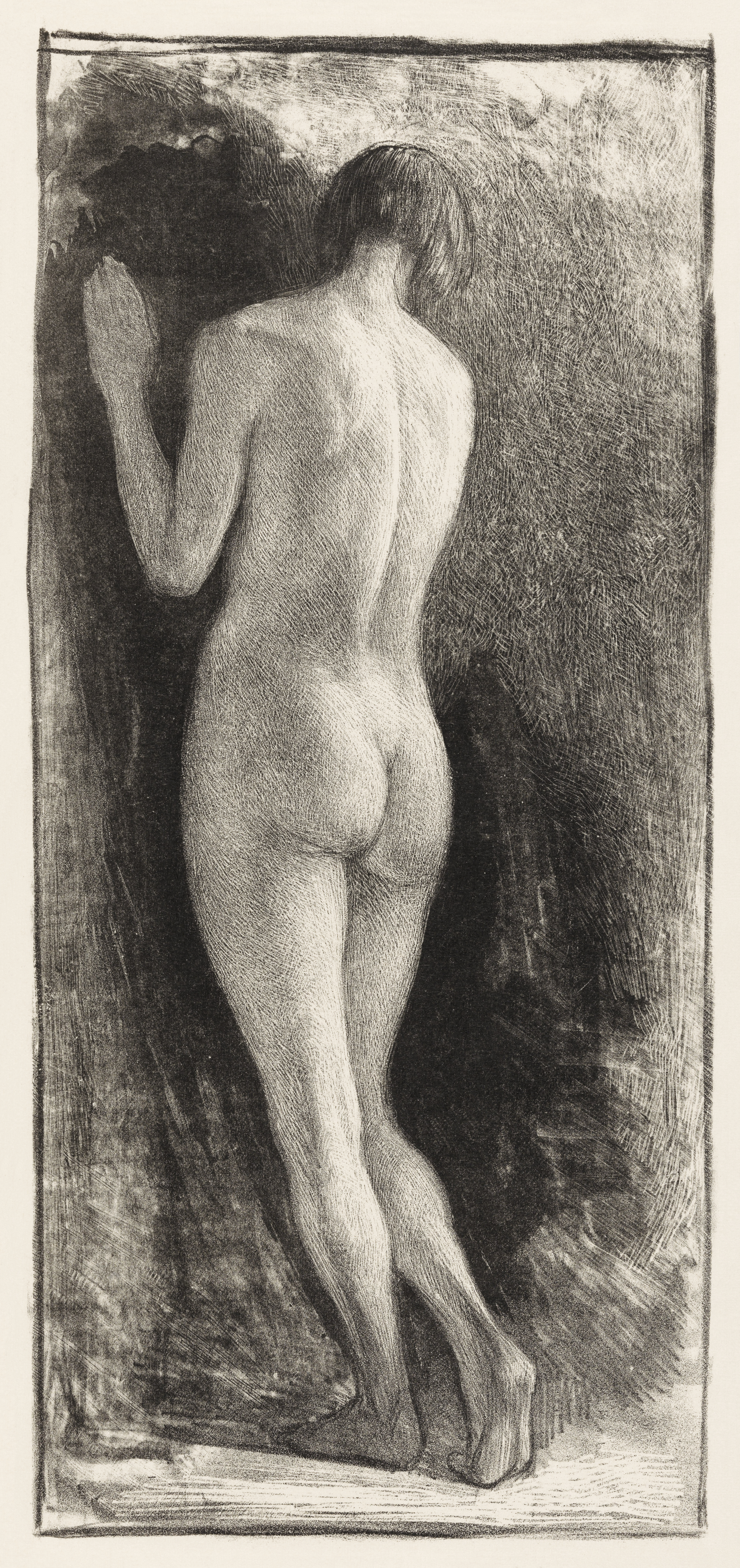 Classical etching of a standing female nude viewed from behind with rich tonal crosshatching