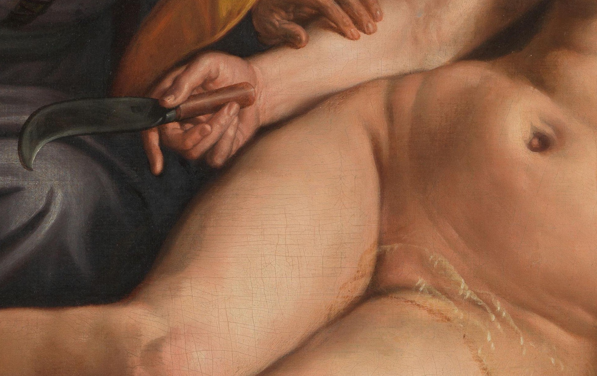 The sinuous curve where waist descends into hip, where the body turns away — the long diagonal of the torso's side creates the painting's most eloquent line, amplified by the proximity of ripe fruit echoing the body's fullness