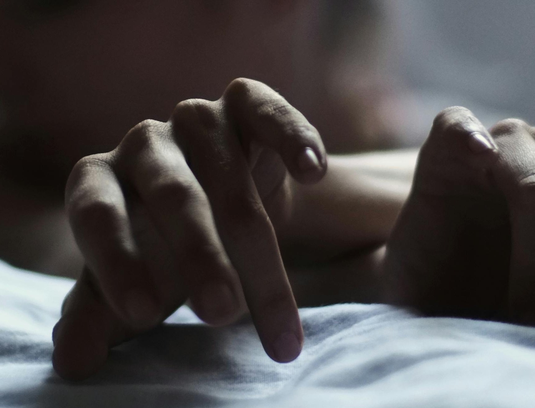 A tighter crop isolating the precise moment where one finger crosses over the other — the small, almost involuntary gesture of interlocking tension. The knuckles catch the cool light; the skin reads as tender against rumpled linen. This is the synecdoche of the whole image: the clutch that says everything.
