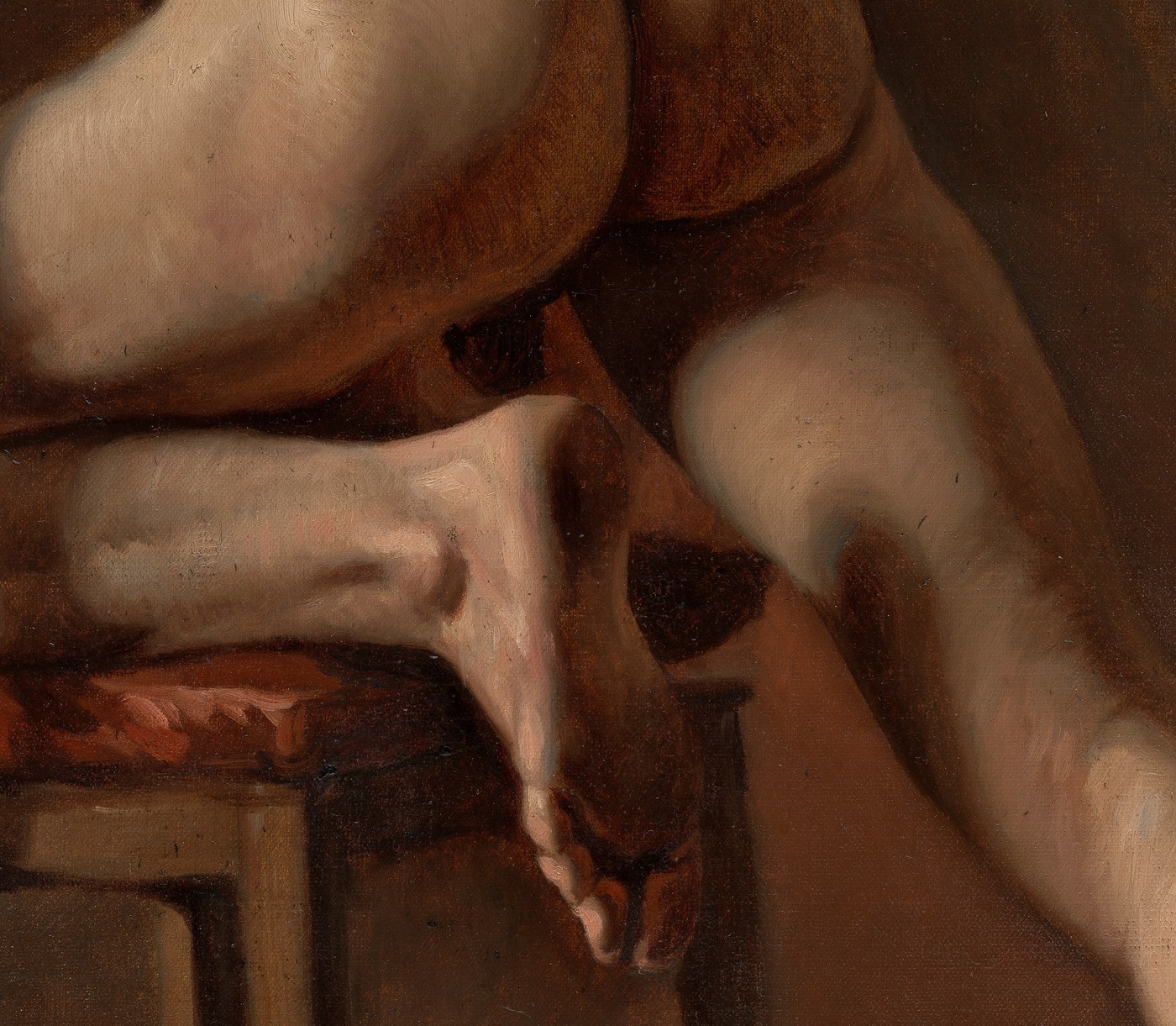 The curve where lower back meets buttock, half-swallowed in warm shadow and the red drapery beneath — this is where the pose pivots, where gravity and anatomy conspire. The shadow does all the work of suggestion; the body turns away and toward us simultaneously.