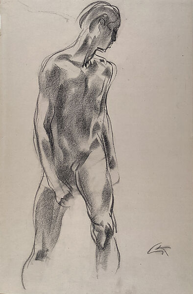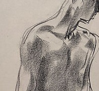 Charcoal life drawing of a standing male nude seen from behind in three-quarter view