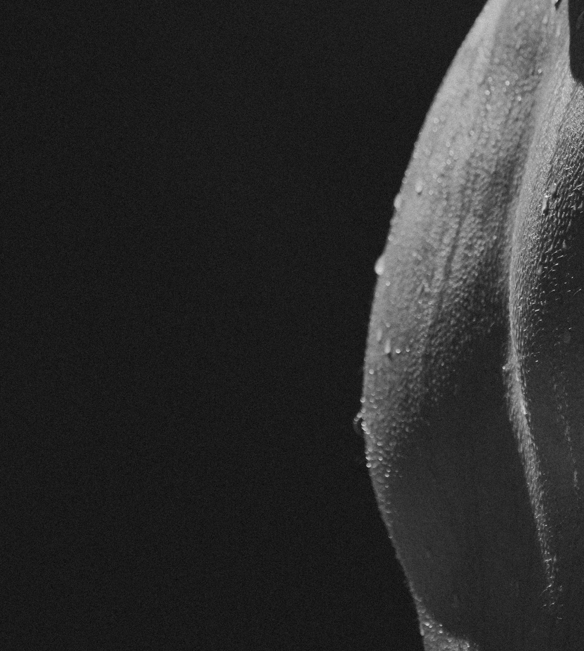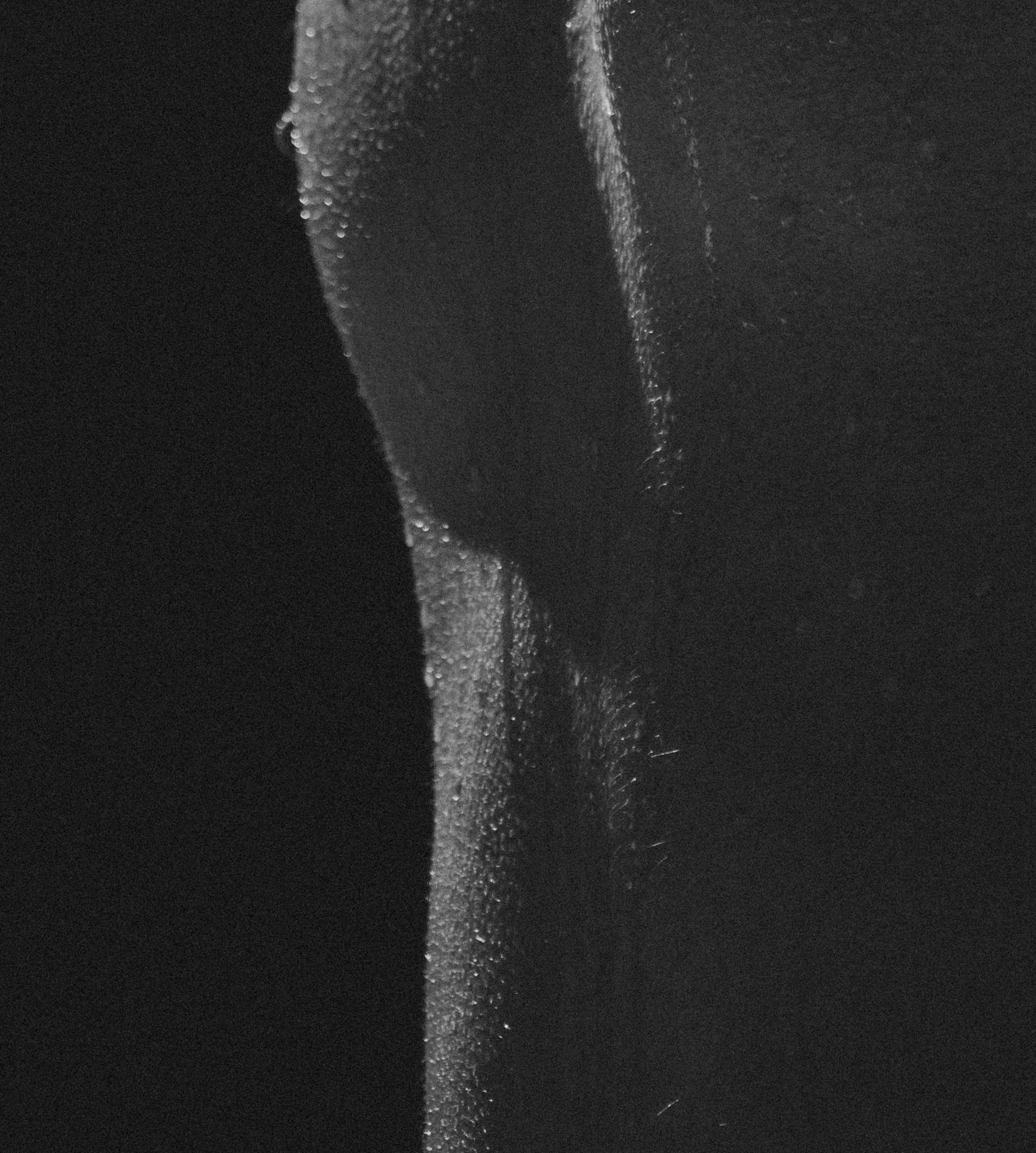 The silhouette curve where the chest meets the underside crescent — light traces the edge like a fingertip, the body defined entirely by its contour against void
