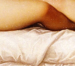 The crossed ankles and relaxed feet against crumpled white linen — an intimate, unguarded detail that grounds the entire composition. The small sleeping dog nearby echoes domestic ease. The body resolves into rest.