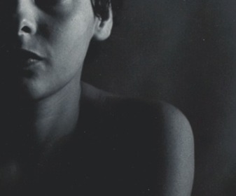 The shoulder's curve catches a soft edge of light against the deep black backdrop, the skin rendered as landscape — the transition from neck to shoulder carries quiet vulnerability