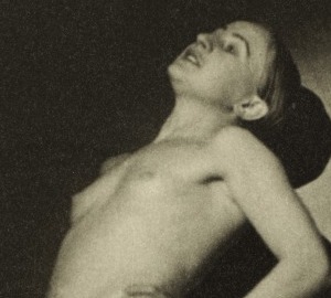 The drawn-back shoulders create tension across the upper chest — the arch of the back pushes the shoulder blades together against what appears to be a wall, implying constraint and release simultaneously