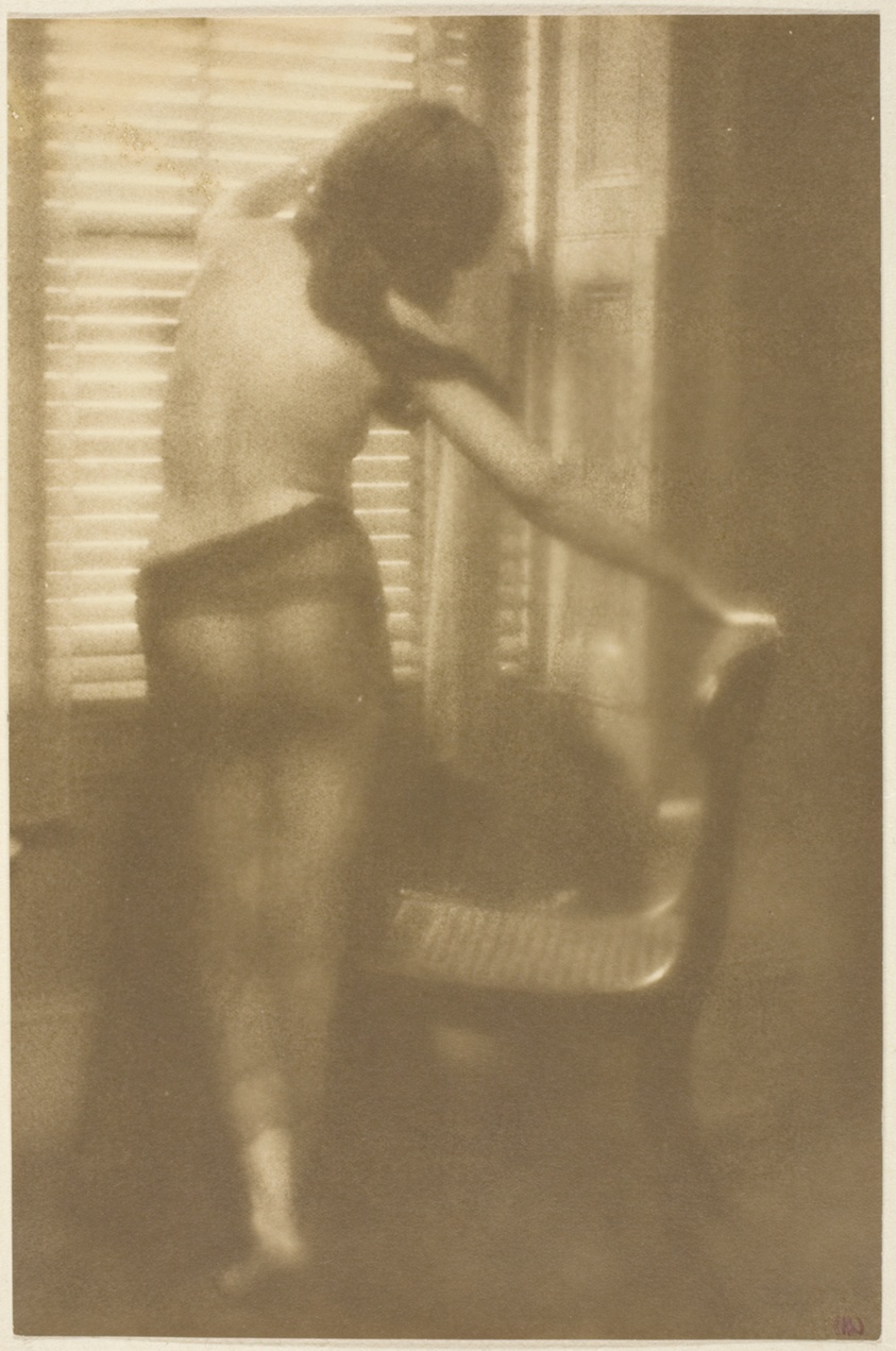Soft-focus pictorialist photograph of a woman standing by shuttered window in intimate domestic setting