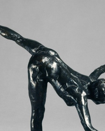The full cantilever of the torso — spine curved, back arched, arms trailing — creates one unbroken line of surrender to momentum. The dark patina swallows detail, leaving only the essential gesture: a body given over entirely to its own motion.