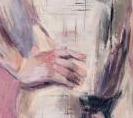The hand resting on the hip carries quiet possession — fingers pressing against the body's own flank, an intimate self-touch rendered in warm pinks and raw strokes that suggest both tenderness and tension