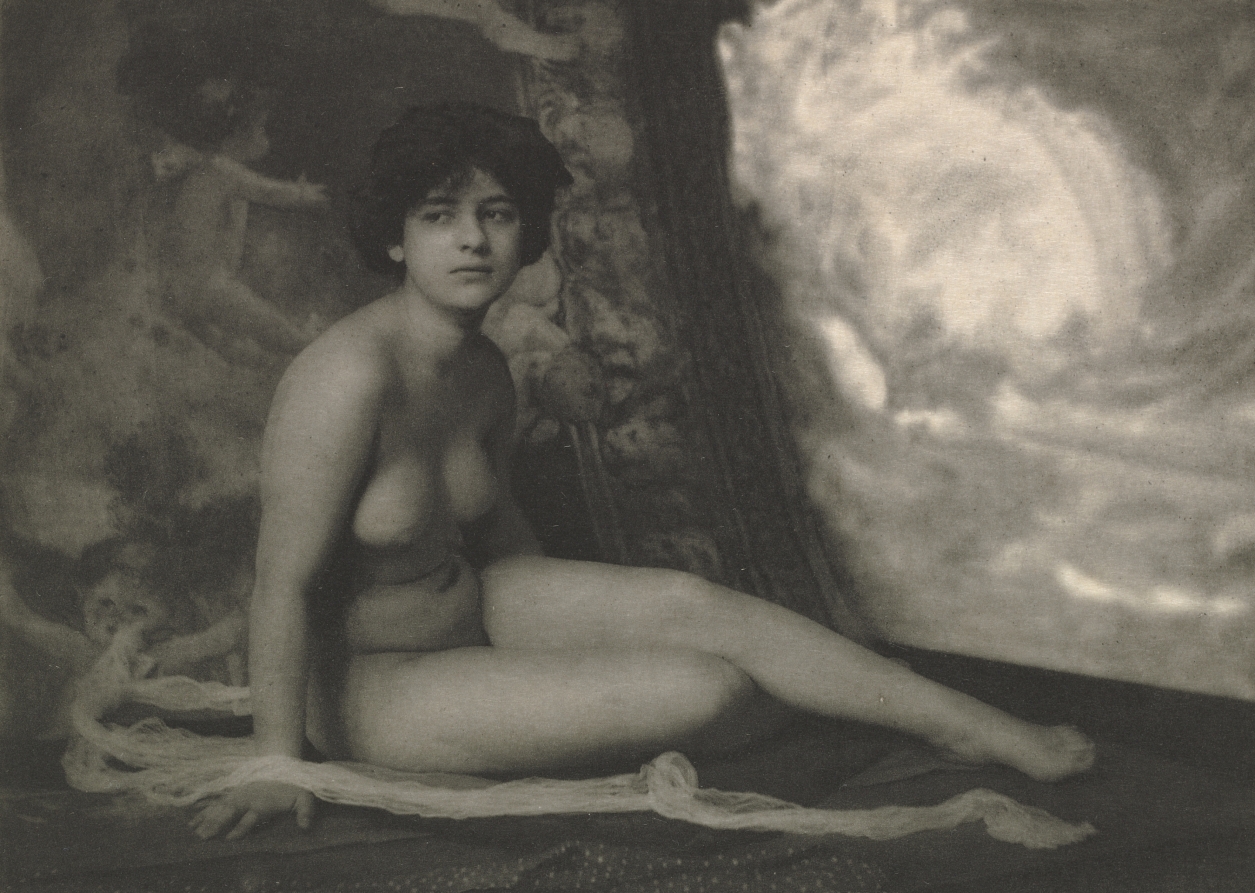 Pictorialist sepia photograph of a seated nude woman with direct gaze against a painterly backdrop