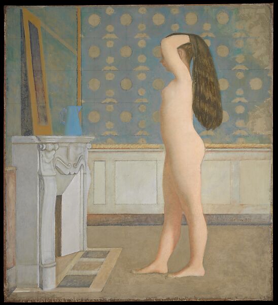 Nude woman standing in profile before a fireplace in a blue-wallpapered room, combing her long brown hair