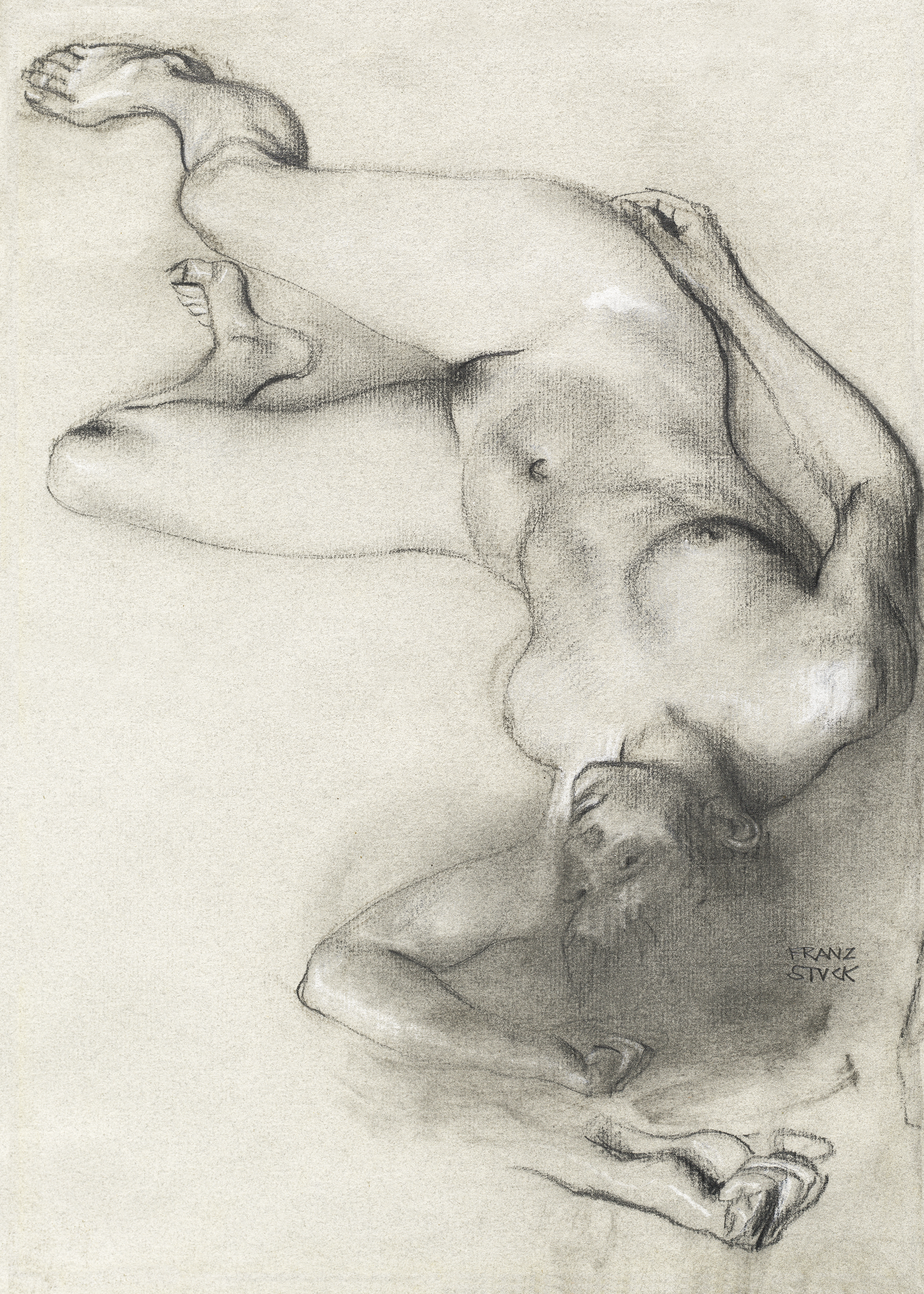 Charcoal academic figure study of a male nude in a dramatic falling pose